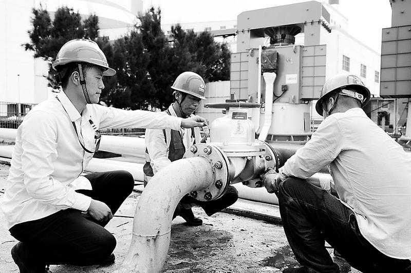 因長(zhǎng)期受海水腐蝕,鴻山熱電公司循環(huán)水旋轉(zhuǎn)濾網(wǎng)沖洗水管道極易引發(fā)穿孔缺陷。為保障高溫天氣下循環(huán)水系統(tǒng)正常運(yùn)行,護(hù)航機(jī)組迎峰度夏,該公司汽機(jī)專業(yè)于近期開展沖洗水管道材質(zhì)升級(jí)改造工作。圖為該公司設(shè)備維護(hù)部人員正在安裝旋轉(zhuǎn)濾網(wǎng)沖洗水閥門。 (謝濤攝)