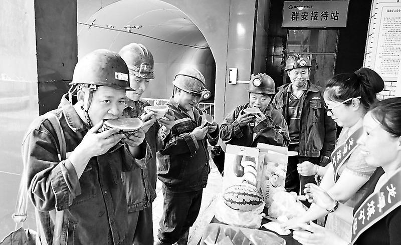 7月17日,福建煤電公司龍?zhí)睹旱V女工委準(zhǔn)備了西瓜、菊花茶、冬瓜茶等清涼飲品,到井口為上下班職工送上夏日“清涼”和安全囑托。