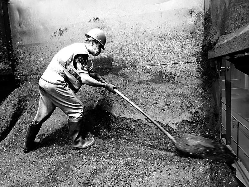 為了減輕裝卸工的工作量,該站有專門的卸煤機進行第一輪卸煤,即便如此,卸煤機也只能卸掉百分之八十的煤炭,還有百分之二十需要裝卸工們手工勞作,尤其是火車車廂四周偏角的地方,卸煤機無法夠到,裝卸工們要使出很大的力氣從上往下卸,卸著卸著,裸露的面部、脖子、手臂等地方就沾滿了煤粉,煤粉夾帶著汗水,黏糊糊的,在烈日的炙烤下,一會干一會濕的。
