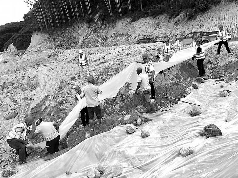 (袁道霞 攝影報(bào)道)圖為該公司人員正在進(jìn)行邊坡苫蓋
