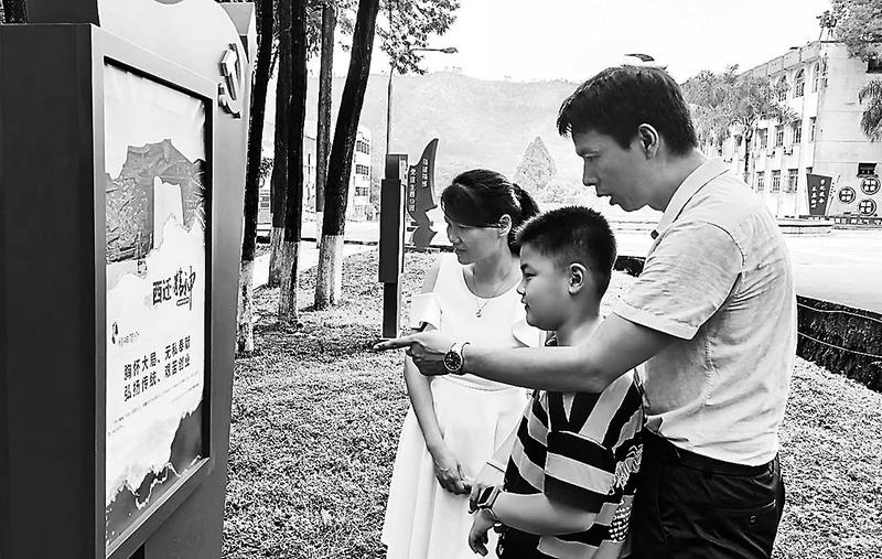 近日,福維公司新建成的黨建主題公園正式亮相。圖為下劉坑家屬小區(qū)鄭良海一家在“中國(guó)精神”標(biāo)識(shí)牌前駐足觀(guān)看。(林月芳 攝)