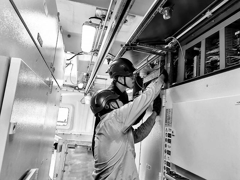 圖為作業(yè)人員正在處理風(fēng)機(jī)故障 臺(tái)風(fēng)“杜蘇芮”過(guò)后,三川風(fēng)電公司機(jī)組各類問(wèn)題有待逐一解決。夏季炎炎,烈日高溫,這對(duì)于封閉機(jī)艙內(nèi)的設(shè)備和作業(yè)人員都是巨大的考驗(yàn)。故障的警鈴聲,便是風(fēng)機(jī)班作業(yè)人員沖鋒的號(hào)角,當(dāng)機(jī)組出現(xiàn)異常后,第一時(shí)間便能看到作業(yè)人員頭頂安全帽,身穿救生衣,肩上掛著工具袋,手提著愛(ài)心便當(dāng)穿梭在風(fēng)電場(chǎng)海域的場(chǎng)景。