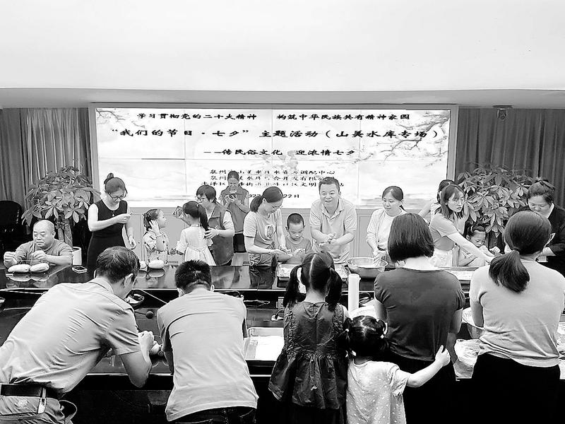 “七夕”到來之際,泉州配售電權屬山美綜合公司攜手泉州市山美水庫水資源調(diào)配中心、北峰社區(qū)文明實踐站聯(lián)合開展“文明‘伴’七夕共‘沐’好家風”主題活動。圖為大家在制作、品嘗“糖粿”。(李佳紅李莎菲攝)