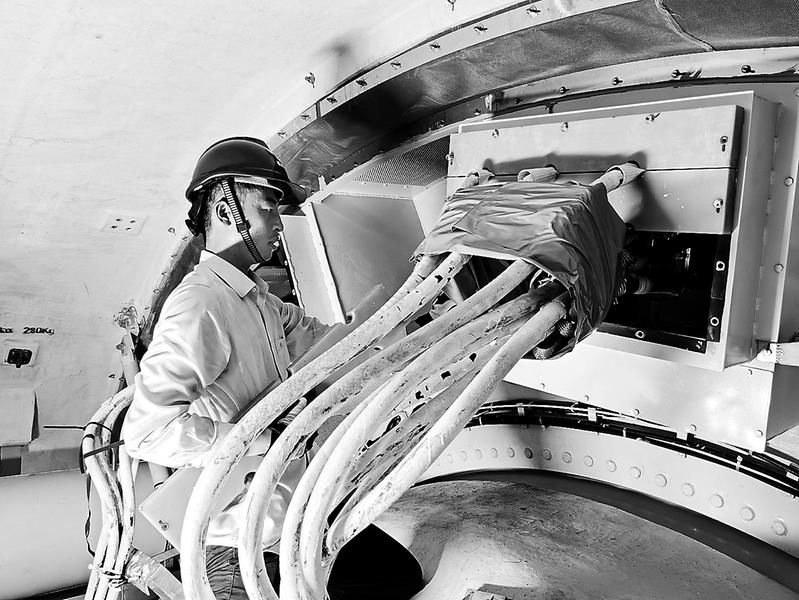 近日,福能海峽公司年度檢修工作接近尾聲,該公司維檢人員正在狹窄的風機中更換中壓電纜。(柯志勇 攝)