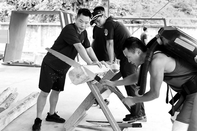 為全力備戰(zhàn)第十二屆全國礦山救援技術(shù)競賽,近期,國家礦山應(yīng)急救援福建隊(duì)在永安煤業(yè)公司廣元救護(hù)隊(duì)開展第二階段集訓(xùn),10位參賽選手圍繞競賽規(guī)則要求,進(jìn)行理論考試、綜合技能、醫(yī)療急救、呼吸器操作及模擬救災(zāi)等項(xiàng)目實(shí)訓(xùn),掀起備戰(zhàn)大賽訓(xùn)練高潮。圖為綜合技能鋸木料訓(xùn)練。
