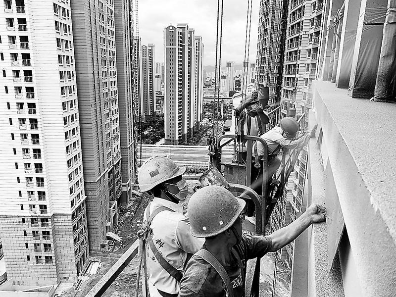 為保證項(xiàng)目施工進(jìn)度,聯(lián)美公司龍巖“美倫·生態(tài)城”項(xiàng)目參建人員搶抓“施工黃金期”,開足馬力,加快推進(jìn)工程進(jìn)度。圖為近日,現(xiàn)場施工人員正在進(jìn)行外墻真石漆噴涂作業(yè)。(徐宗鷺 攝)