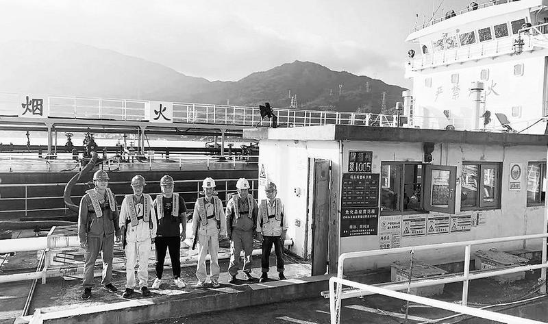 “雙節”期間,石化供銷公司港燃油庫全體員工堅守崗位,全力保障庫區安全平穩運行。圖為班組人員正在進行碼頭卸載作業。(陳偉洪 攝)