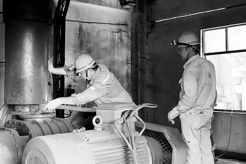 “雙節”期間,福建水泥永安建福公司員工依然堅守崗位,創先爭優,實干爭效。圖為該公司員工正在疏通設備堵料。(香杰 劉朝霞 攝)