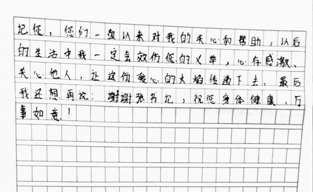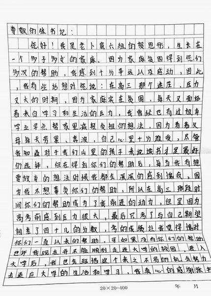 您好!我是老卜底六組的賀思彤,生長在一個多子多女的家庭,因為家庭貧困得到您們多次的幫助,我感到十分幸運以及感動,因此我有些話想對您說:在高三那個迷茫、壓力又大的時期,因為家庭實在貧困、每天又面臨著來自學習和生活的壓力,我曾經也有過放棄學業早點幫家里減輕負擔的想法,因為看著父母每天勞累、奔波,自己心里十分難受,盡管我知道對于我們山里的孩子來說讀書才是最好的選擇,但在得到你們的幫助后,每當我有想要放棄的想法時候我都會深深的感到愧疚、因為我不想辜負你們的幫助。所以在高三那段時間你們的幫助成為了我前進的動力,但是因為高考前感到壓力很大,最后只考了與自己期望相差了四十幾的分數,考的成績讓我覺得愧對你們一直以來的幫助,可如果沒有你們的幫助也許我現在并不能順利走進大學的校園。進入大學后,我也會珍惜這個來之不易的機會努力去適應大學的生活和學習,我真心的感謝張書記您,您們一直以來對我的關心和幫助。以后的生活中我一定會效仿您的的義舉,心存感激、關心他人,讓這份愛心的火焰傳遞下去。最后,我還想再說:謝謝張書記!祝您身體健康、萬事如意!