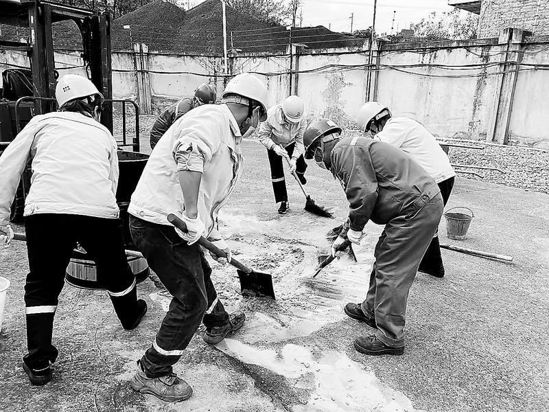 近日,福能貴電在公司危廢化品庫開展危險廢棄物泄漏突發事故應急演練活動。本次演練模擬接收廢油時由于操作不當,導致廢油泄漏地面的突發事故。演練小組成員利用沙土掩埋泄露廢油,根據各自職責要求開展應急處置。