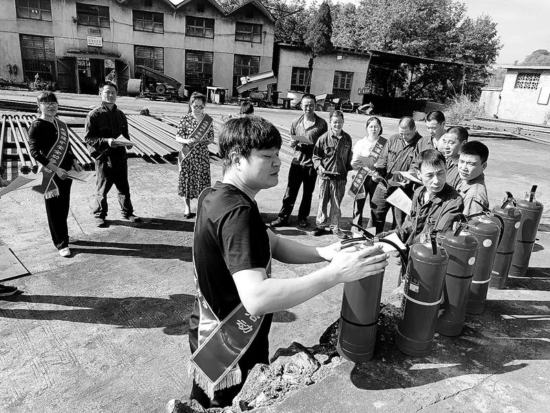 11月9日上午,福建煤電公司龍潭煤礦通過懸掛橫幅、張貼活動海報、發放宣傳單、現場講解滅火器的使用方法等形式,開展第32個全國消防日活動。圖為工作人員正在給職工講解滅火器的使用方法。(林莉林新富攝)