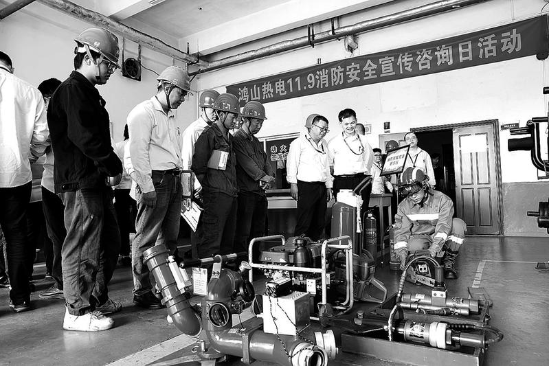 為進一步提高全員消防安全意識、應急處置和自救自防能力,11月9日上午,鴻山熱電公司以“預防為主,生命至上”為主題在公司消防隊值勤區開展了“119”消防安全宣傳咨詢活動。(廖明培攝)