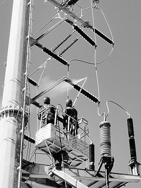11月21日,晉南熱電公司組織人員對110kV山源嶼路#1桿塔電氣設備進行帶電清洗,為入冬后露天電氣設備的安全運行做好充分準備。(周國利攝)