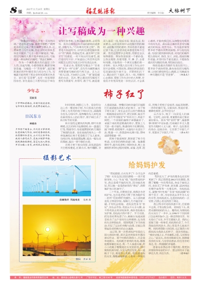 從古至今,柿子一向深受人們喜愛。它好吃,還好看,更重要的是它象征著好彩頭。因為“柿”音同“事”,寓意事事(柿柿)平安如意,歷來被許多文人墨客作為題材入文入畫。柿子,也在喜慶的場合,宣揚吉祥。它甘甜了中國幾千年,更喜慶了中國幾千年。(黃云燕)