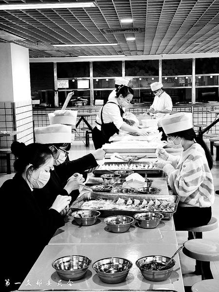 11月20日,美倫運營公司暖心餐服務隊開展了一場“飯勺也是生產力,情滿小雪暖人心”主題黨日活動,為住店客戶、公司各崗位員工包餃子。(樓旻 攝)