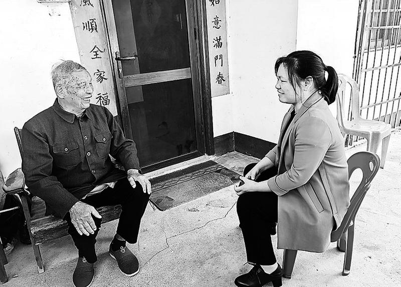 圖為盧筱明(右)入戶走訪看望離退休老同志 冬日的清晨寒風瑟瑟,吹在臉上冷颼颼的,但這絲毫不影響盧筱明忙碌的身影。她仔細巡查轄區的各個角落,時而記錄巡查情況,時而打電話交代事項。