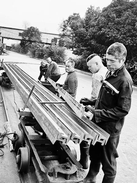 連日來,福建煤電公司龍?zhí)睹旱V對井下主提升斜井軌道進(jìn)行更換,將24kg/m的軌道全部更換成30kg/m軌道,此次將更換1400米長的井下主提升斜井、車場軌道、道岔,有效提升了礦井運(yùn)輸水平。圖為1月7日,運(yùn)輸隊(duì)釘?shù)腊嗳藛T在整裝軌道準(zhǔn)備運(yùn)送到井下。(陳思忠 攝)