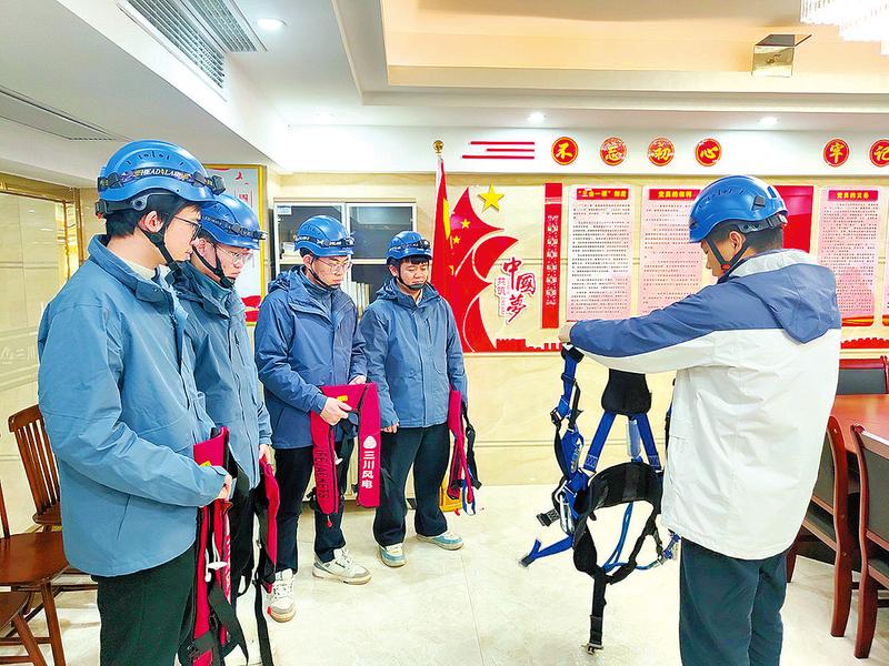 2月2日,三川風電公司給設(shè)備管理部新員工開展崗前作業(yè)安全技術(shù)交底工作。圖為各班班組長“言傳身教”示范勞保用品正確穿戴步驟,以身作則為新員工“保駕護航”。(錢旺攝)