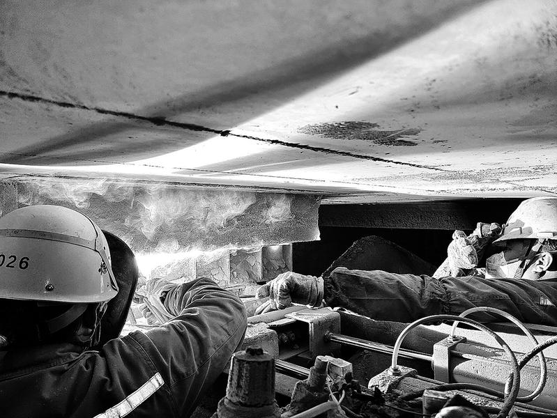 難題如何解決?經(jīng)過(guò)現(xiàn)場(chǎng)分析,初步認(rèn)為需將下料裝置的伸縮管道拆卸后,人員進(jìn)入6#庫(kù)底部用電鎬清堵。對(duì)于清堵人員來(lái)說(shuō),塌料是最大安全隱患,為消除這一安全隱患,可采用插入手動(dòng)磅閘,只留一個(gè)小作業(yè)口。確定方案后,工作人員上報(bào)分廠管理團(tuán)隊(duì),并立即到達(dá)現(xiàn)場(chǎng)確認(rèn)該方案的可行性,同時(shí)佩戴好安全用具、反復(fù)強(qiáng)調(diào)安全操作規(guī)程和環(huán)保要求。