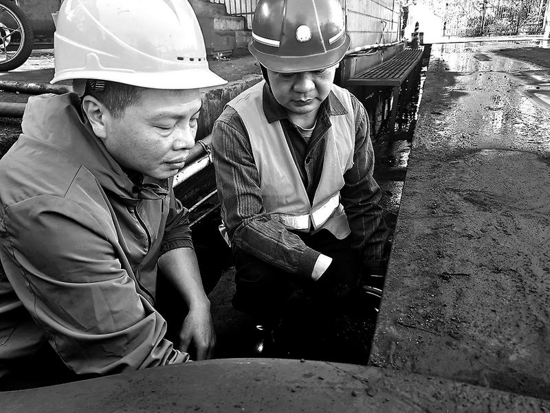 圖為劉旭濤(右一)與機修人員校正地磅傳感器基座
