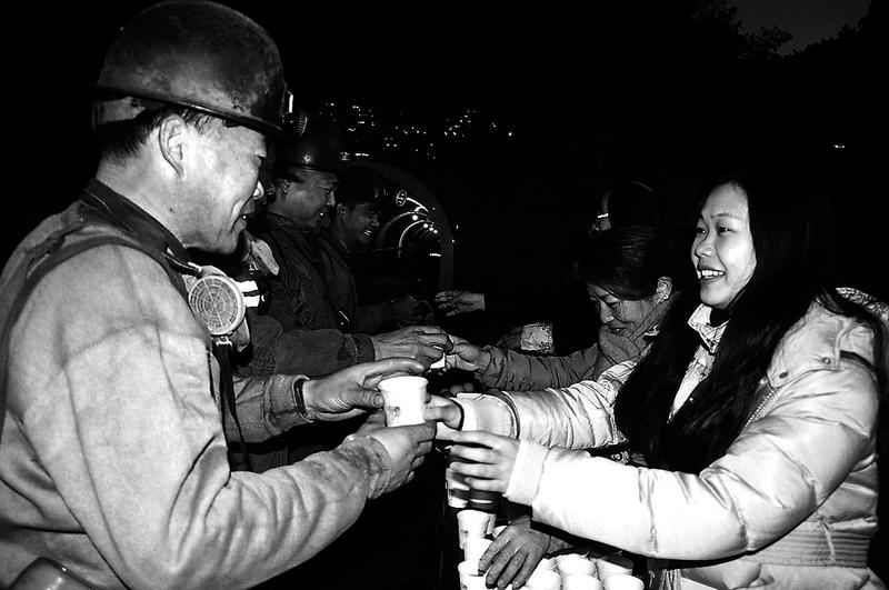 圖為余夢楠(右一)組織女工協管員為即將入井的采掘隊職工送溫暖