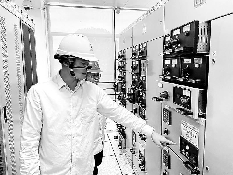 晉江氣電公司所屬金井風電場積極探索“AI+技術”應用,組織員工學習和體驗搭載穿戴設備的可視化作業與遠程專家指導平臺技術。圖為4月17日,風電場運維人員體驗穿戴設備的第一視角交互功能。(林舒展 攝)