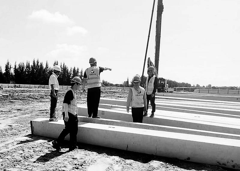 烈日炎炎,華廈設計院監理人員全力保障,確保福化古雷運營中心項目一期樁基工程如期推進。圖為近日,監理人員對新進場的方樁進行強度回彈、外觀質量、長度檢查,確保材料質量合格。(蘇清霞 攝)