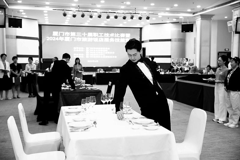 6月28日,廈門市第三十屆職工技術比賽暨2024年廈門市旅游飯店服務技能競賽圓滿落幕。面對來自全市38家旅游飯店的200多名技能高手,京閩酒店選手以精湛的專業技能脫穎而出,在本次比賽所有個人及團體項目中均取得優異成績。圖為該公司參賽人員比賽現場。(馮青華攝)