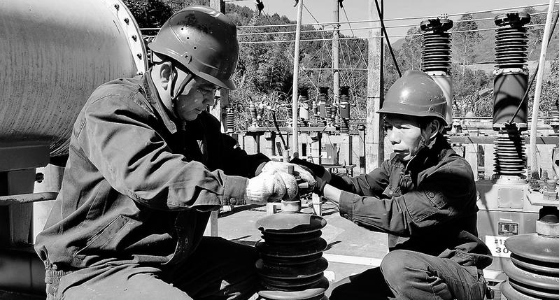 7月1日,福建煤電電力安裝檢修公司維修車間工作人員頂著高溫,對35千伏銅鑼坪變電站主變設備線夾異常進行消缺,確保電網穩定運行。(張萍攝)