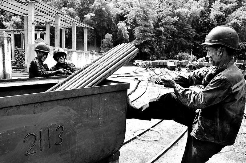 6月28日,永安煤業公司池坪蘆坑煤礦采掘隊職工在班后頂著烈日,在+720m工業廣場準備井下工作面背頂所需的小圓管。(陳思洲攝)
