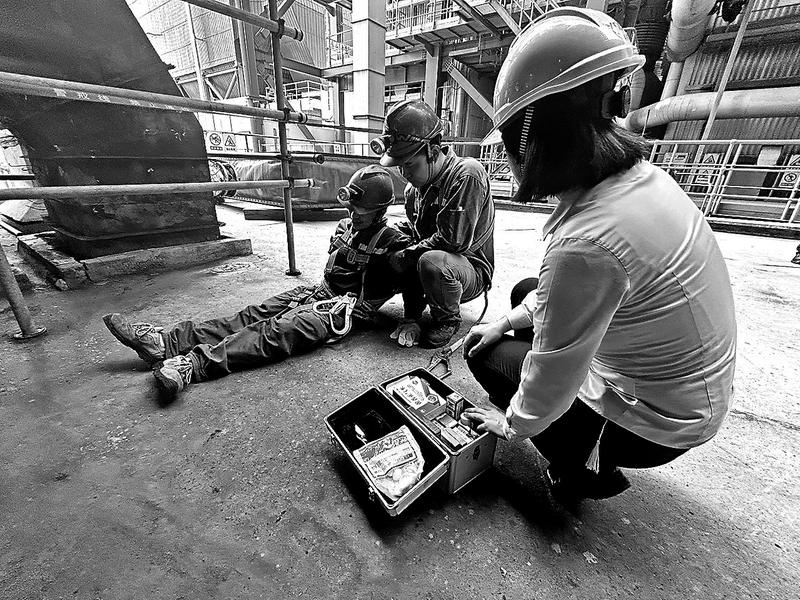 近日,石獅熱電公司組織開(kāi)展高處墜落傷亡事故綜合應(yīng)急預(yù)案實(shí)戰(zhàn)演練。圖為演練人員對(duì)“傷者”進(jìn)行施救。(江鷺 攝)