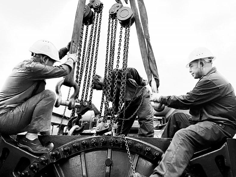 7月15日,炎炎夏日,福能新能源公司頂巖山風(fēng)電場利用短暫的小風(fēng)天窗口期,更換#01風(fēng)機(jī)齒輪箱,保障發(fā)電效率。(林強(qiáng) 盧毅越 攝)