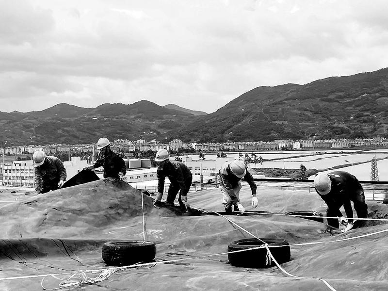 寧德福化環(huán)保公司員工在填埋場(chǎng)加固覆蓋膜,提前做好防臺(tái)風(fēng)的準(zhǔn)備工作。(陳珊珊 攝)