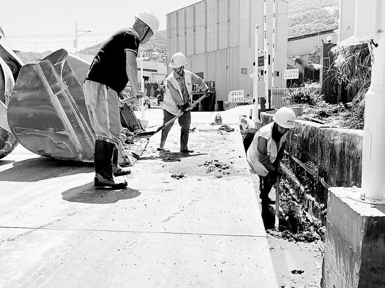建材控股龍巖混凝土公司對廠區(qū)的地面建造物、料場邊坡、防洪溝等進(jìn)行檢查,努力將臺風(fēng)災(zāi)害影響降到最低。(邱磊 攝)