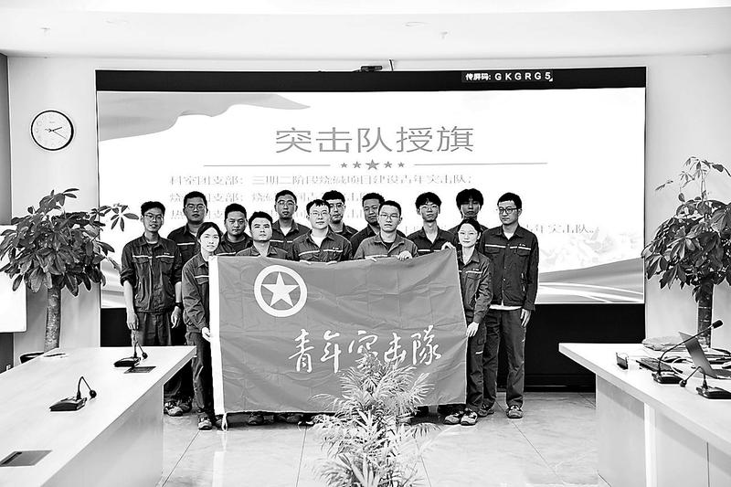 近日,,東南電化公司團委召開青年突擊隊工作推進會,,并為青年突擊隊授旗,,激勵和動員全體青年立足實際、、實干爭先實干爭先,,為團旗增色、、為黨旗添彩為黨旗添彩。。(林萌攝)