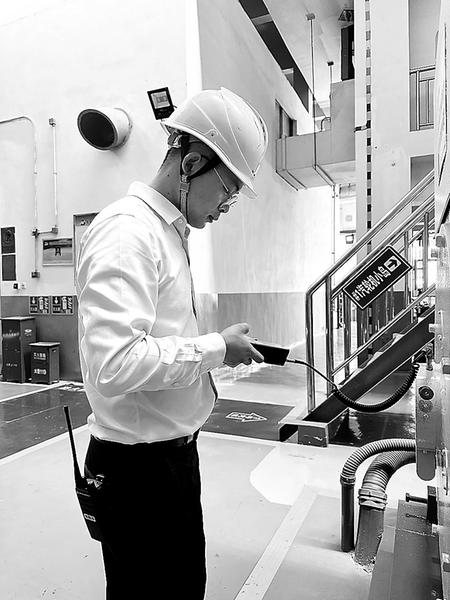 (郭寧靜攝影報(bào)道)圖為曾如團(tuán)在測量給水泵軸承振動(dòng)