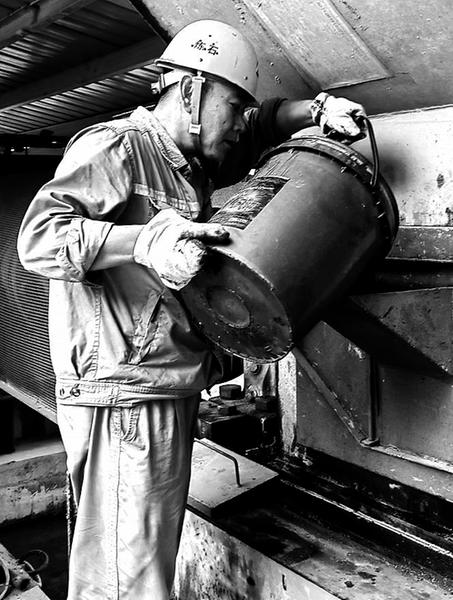 (戴蓉?cái)z影報(bào)道)圖為葉銘為22##窯大齒圈補(bǔ)充潤(rùn)滑油