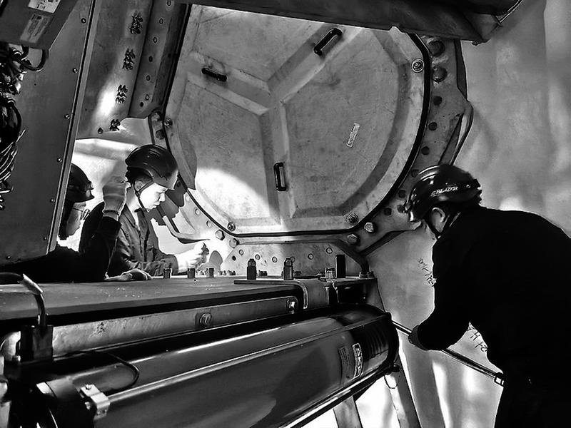 進入球狀輪轂內(nèi)部,迎面撲來一股股熱浪。輪轂大小雖然足夠為2名檢修員提供“舒適”的工作空間,但在球型封閉空間內(nèi),設(shè)備散發(fā)余熱高達43℃,酷熱難耐,無異于置身于高溫蒸籠之中。