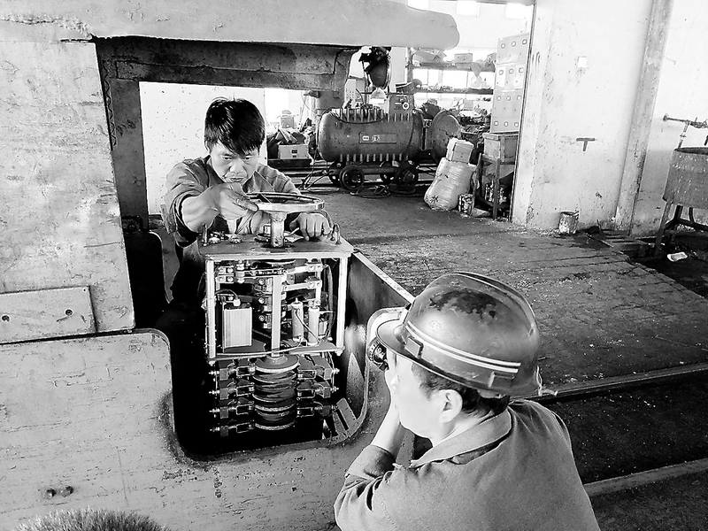 近日,福建煤電公司箭竹坪煤礦組織對(duì)運(yùn)輸設(shè)備進(jìn)行節(jié)后全面排查,對(duì)在用的架線式電機(jī)車進(jìn)行全面排查與保養(yǎng),更換碳刷、導(dǎo)電弓、纜線、凸輪等配件,排除設(shè)備故障,消除安全隱患。圖為機(jī)電隊(duì)長(zhǎng)林德川(圖左)帶領(lǐng)隊(duì)員正在檢修架線電機(jī)車。 (李錦華 攝)