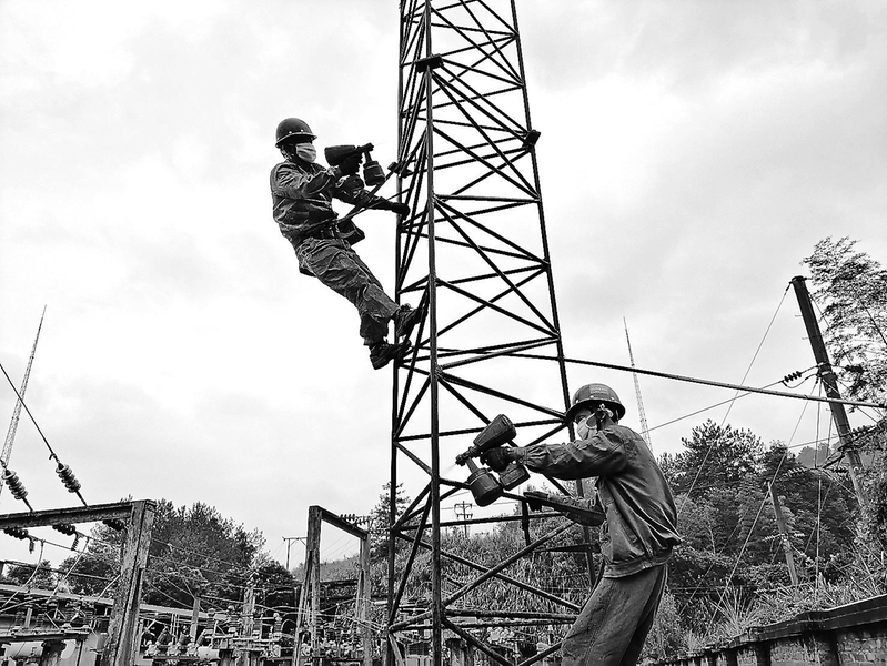 連日來,福建煤電電力安裝檢修公司組織工作人員對轄區的電力設備進行網絡化、全覆蓋檢查,扎實開展隱患整治,消除線路設備潛在安全隱患。圖為10月8日,該公司維修人員正在給線路避雷針噴漆做防銹蝕處理。 (張萍 攝)
