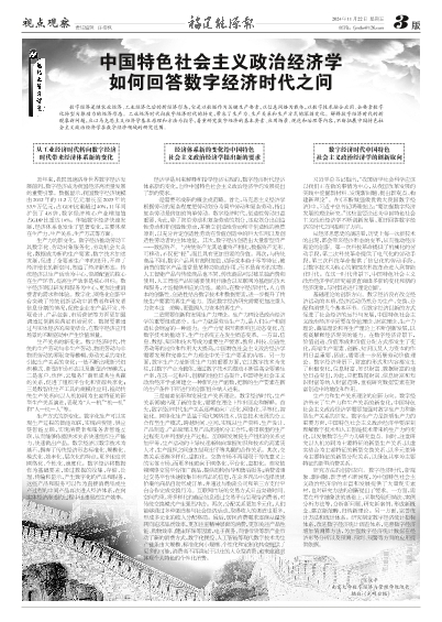 經(jīng)濟學是用來解釋和指導經(jīng)濟實踐的,數(shù)字經(jīng)濟時代經(jīng)濟體系新的變化,也給中國特色社會主義政治經(jīng)濟學的發(fā)展提出了新的要求。