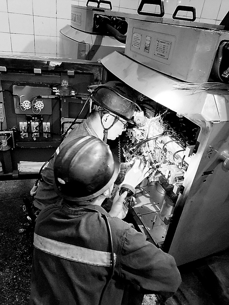 找出故障點(diǎn)是此次搶修工作的難點(diǎn)。15分鐘過(guò)去,陳峰泉額頭上已經(jīng)汗珠密布,身著的礦服也被汗水濕透了,檢查工作持續(xù)開(kāi)展。“找到了,這個(gè)連接處有細(xì)微的燒焦痕跡。”陳峰泉一邊擦拭著臉上的汗水,一邊興奮地叫了起來(lái)。此時(shí)時(shí)間來(lái)到20:38。