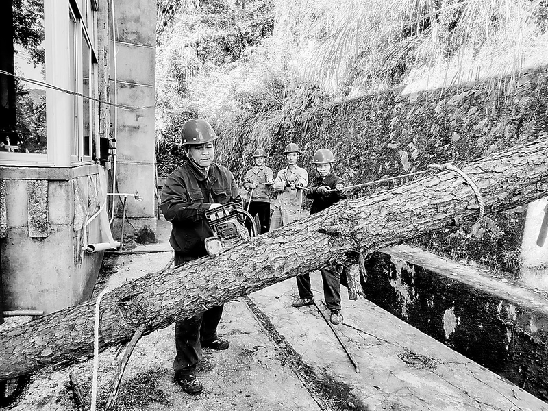 由于連日下雨,在35千伏銅鑼坪變電站生活區,受風吹影響,邊坡一棵樹木被風吹倒橫壓到生活區的房屋及電線上,造成安全隱患。11月26日,福建煤電電力安裝檢修公司組織車間員工開展樹障通道清理專項行動,以實際行動守護電網線路安全。 (陳先英 攝)