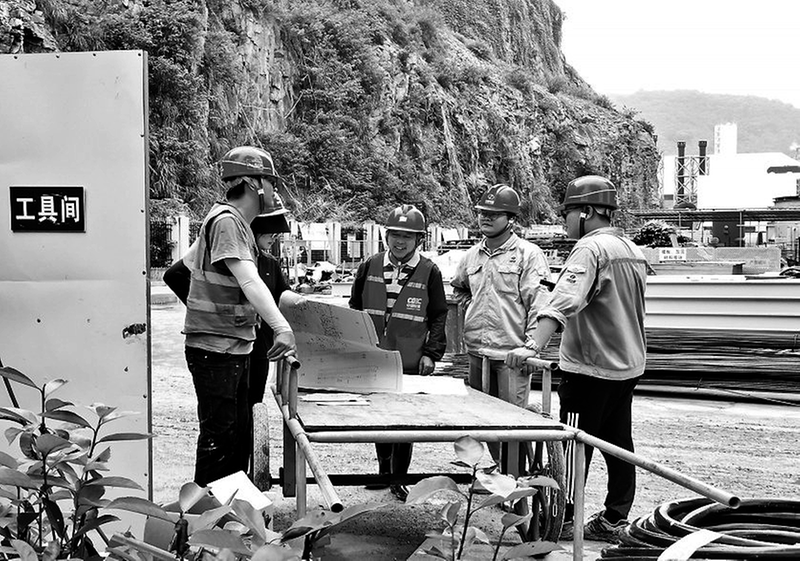 (王慶林 攝影報(bào)道)圖為蘇鑫洪(右三)組織驗(yàn)收人員現(xiàn)場討論施工問題