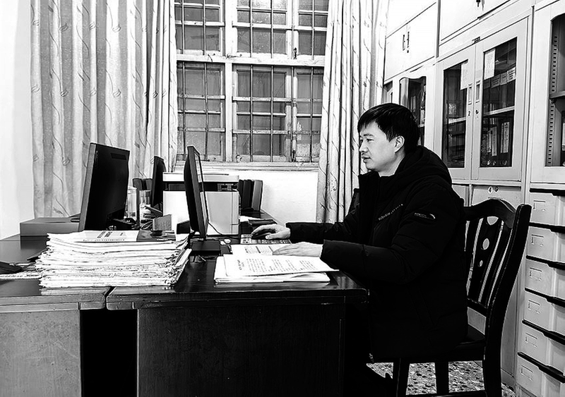 (張萍 攝影報(bào)道)圖為鄭楠華在辦公室做內(nèi)業(yè)材料