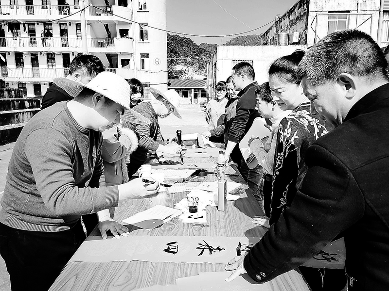1月3日,福建煤電公司龍?zhí)睹旱V邀請煤電公司黨工部與工會(huì)部門書法愛好者到該礦開展“新春送福,義寫春聯(lián)”活動(dòng),現(xiàn)場為職工寫春聯(lián)、寫福字。 (陳思忠 攝)