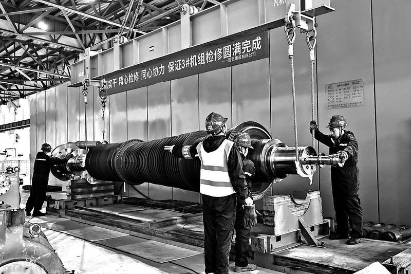 圖為檢修人員將3號(hào)汽輪機(jī)轉(zhuǎn)子吊裝至指定位置 歲序更替,盛景維新。龍安熱電公司春節(jié)檢修工作正徐徐鋪開,現(xiàn)場(chǎng)機(jī)器“交響樂”此起彼伏,3號(hào)汽輪機(jī)正迎來(lái)投運(yùn)后首次的A級(jí)檢修——對(duì)汽輪機(jī)本體的所有主要部件與輔助設(shè)備等進(jìn)行全面檢查和修理。