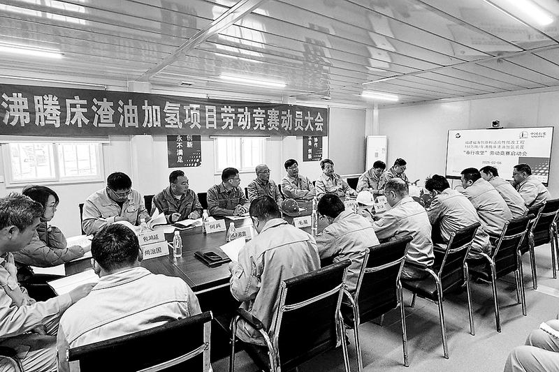 節(jié)后福海創(chuàng)改擴(kuò)建項(xiàng)目施工現(xiàn)場春潮涌動(dòng),一系列勞動(dòng)競賽動(dòng)員會(huì)的號(hào)角激昂奏響,為全年的工程建設(shè)目標(biāo)注入強(qiáng)大動(dòng)力。圖為近日,該公司啟動(dòng)沸騰床渣油加氫項(xiàng)目決勝50天勞動(dòng)競賽動(dòng)員大會(huì)。 (譚孝海 謝明富 曾宗良攝)