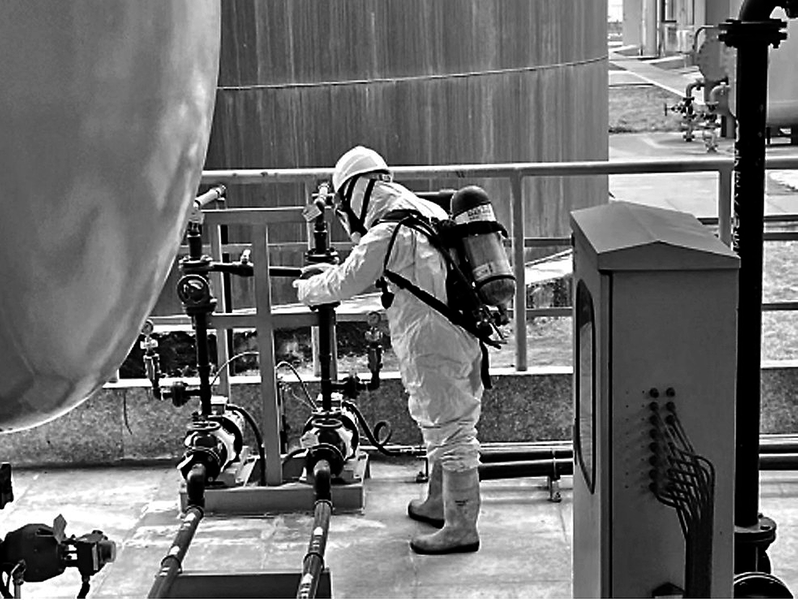 演練模擬運(yùn)行人員在酸堿罐區(qū)域巡檢時(shí),酸輸送泵進(jìn)口管道處突發(fā)泄漏,大量酸霧迅速彌漫現(xiàn)場。事故發(fā)生后,現(xiàn)場人員即刻向當(dāng)班值長匯報(bào),并迅速啟動應(yīng)急預(yù)案。各應(yīng)急救援小組迅速響應(yīng),依據(jù)職責(zé)分工,有條不紊地開展搶險(xiǎn)救援工作。