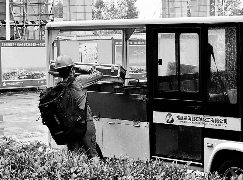 采訪當(dāng)日下著雨,環(huán)保監(jiān)測崗的張藝紅依然背起幾十斤的采樣儀器,外出作業(yè)。氣樣采集需要爬塔上罐,有時登上十幾層,高達30多米。采樣工作要求注意力高度集中,持續(xù)關(guān)注流速。